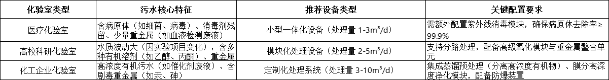 不同類型化驗室的污水成分、排放量差異較大,化驗室污水處理設備選型需 “因地制宜”,而非盲目套用統一標準。以下針對三類典型場景,提供定制化選型方案: